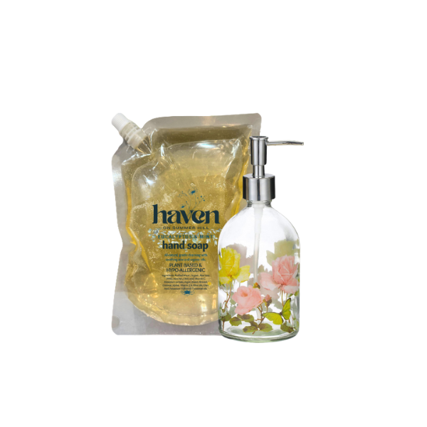 Dispenser + Soap Refill: Our Custom Suds options allows you to select from our inventory of sturdy, decorative glass dispenser, combined with a Haven soap scent and refill size of your choice ($9.00 for 16oz and $16.00 for 32oz). Perfectly paired with our soap refills, we encourage use of our refillable glass dispensers, for a more eco-friendly solution. Our decorative and sturdy Glass Dispensers are also carefully sourced and always look great, a simple way to elevate the aesthetic of any kitchen or bath.