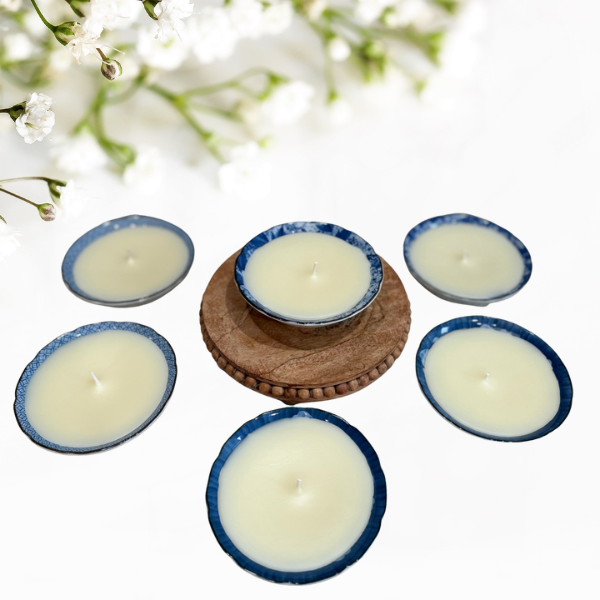 The 6 Sisters is a delicate set of delft blue dessert dishes in 2 lovely floral prints, a first edition piece from our Vintage Burns Collection of Rescued Vessels. Made from 100% natural beeswax and lightly scented with sweet orange & vanilla essential oils, it's one of our favorites and sure to be enjoyed and reused, by any lucky recipient.